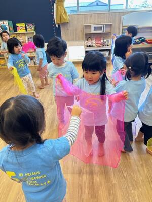今日は小さめのスカーフをお友達と持って、ボール運びです。