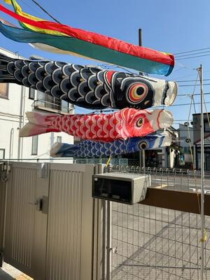 園庭には、大きなこいのぼりが元気に泳いでいます。