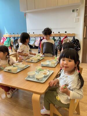「順番にスープを運びますよー」の先生の声に「はーい!」と元気いっぱいです。