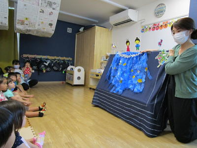 七夕の由来を保育士がペープサートで説明をして、真剣に聞いていた子どもたち⭐︎